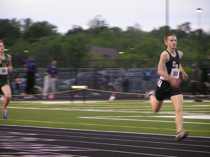 This is also one of Kenny's favorite photos. (Compare to the first one. See a pattern?) I was never a fan of this photo; it's too blurry, it's a bit grainy from the impending darkness, and I cut off half of the guy behind Kenny. But no matter: Kenny hadn't beaten that guy all year, and in this regional meet, the last meet of his high school career, he passed five people in the final lap of the 3200 meter run, including that guy. Any visual proof of that accomplishment would suffice. (There is, of course, written proof.)