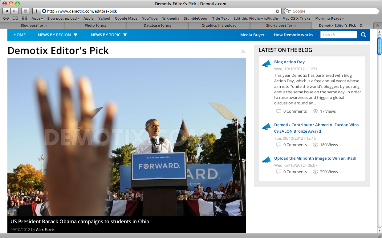 The first: The second photo below was an Editor's Pick at Demotix (screenshot). With almost a month of the campaign to go, maybe this is only the first of a few to go with frequent appearances on the front page. They also liked the gallery of photos enough to feature them on the front page for a little while.