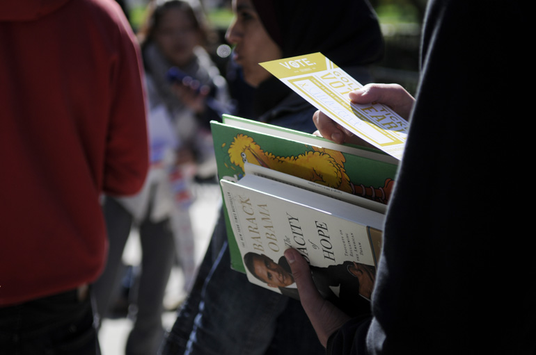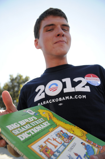 The third: Lucas Perie, a junior at OSU who was in the VIP group, bought Big Bird's Sesame Street Dictionary, Number 8 (T through Z) at a thrift store for Obama to sign. I had to leave before Lucas got his book back, but it did get handed to the Secret Service agent in charge of such things, along with his copy of The Audacity of Hope. That story starts at photo 9.